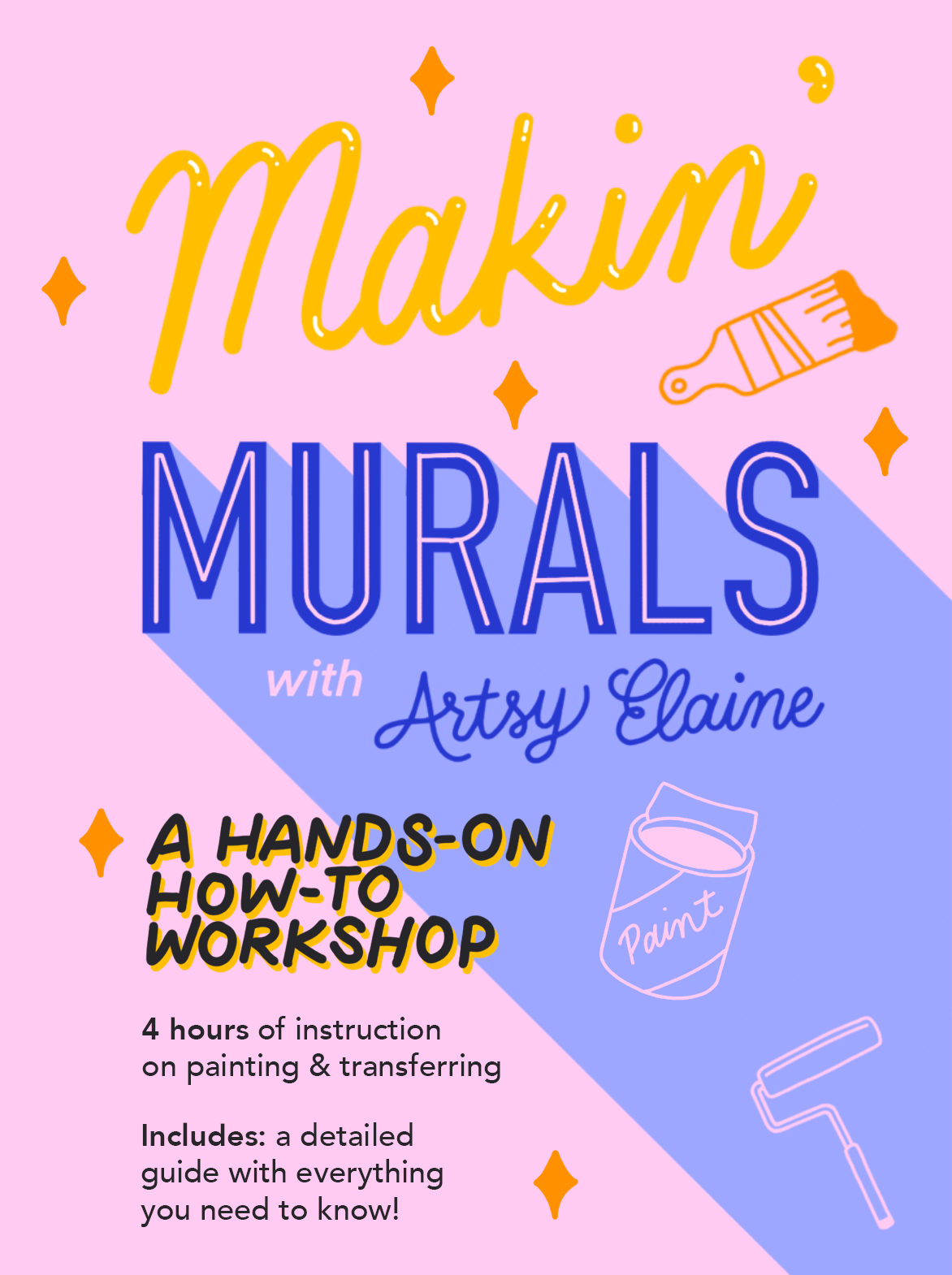 What: A hands-on how-to mural workshop with experienced muralist Artsy Elaine. You will get 4 hours of instruction on painting and transferring designs BIG onto walls. We will be practicing the 4 most common transfer techniques by painting Elaine’s pre-made designs on large boards and on one of the windows of the studio. Students will not take home a finished mural, but will gain hands-on experience transferring designs and painting. Instructor will share information about how to install murals, as well as answer any questions during the event. Students will also receive a detailed PDF guide with all Elaine’s recommendations and learnings for mural best practices.